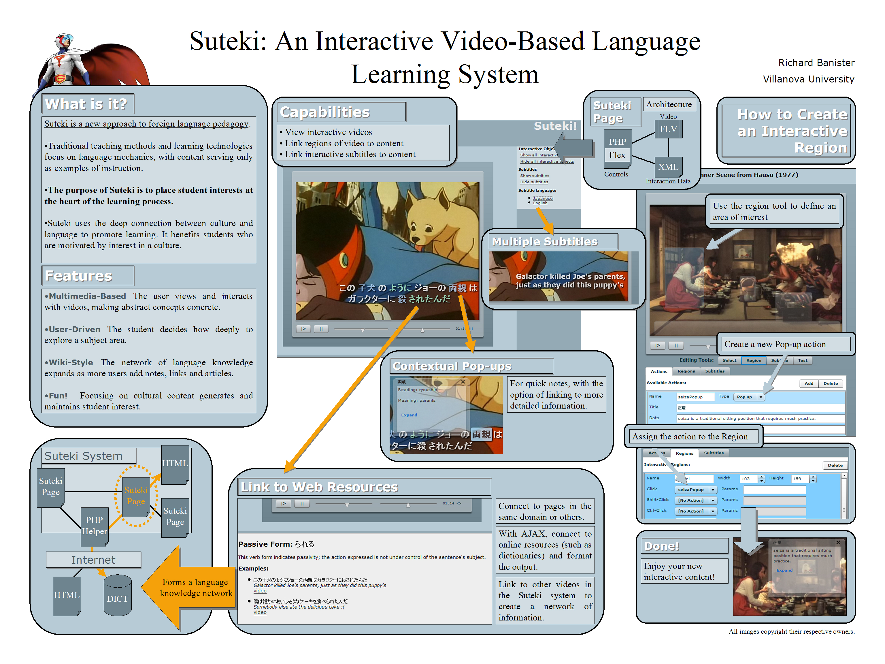 Suteki uses interactive video to create an immersive environment that encourages voluntary exploration as a method of learning language. Users can upload videos, tag regions and add subtitles dynamically, and link those regions to explanatory content or other videos or websites. The result is a rich foreign language environment that users can explore as they choose, learning in the ways that suit them best.